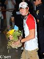 [OSEN=인천공항,지형준기자] 2011 국제수영연맹(FINA) 세계선수권대회를 마친 한국 대표팀이 1일 오후 인천공항을 통해 입국했다. 자유형 400m에서 금메달을 획득한 박태환이 선물로 받은 꽃다발을 들고 입국장을 나서고 있다./jpnews@osen.co.kr